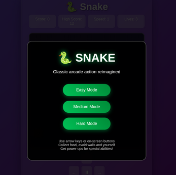 Classic snake gameplay enhanced with power-ups, multiple difficulty modes, and modern polish. Eat, grow, survive - how long can you last?